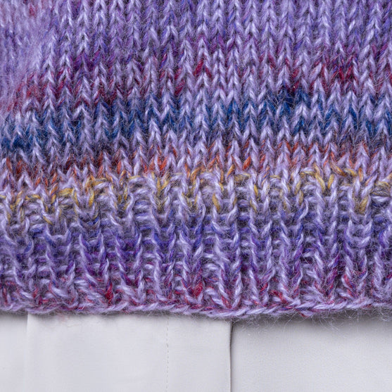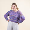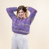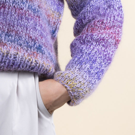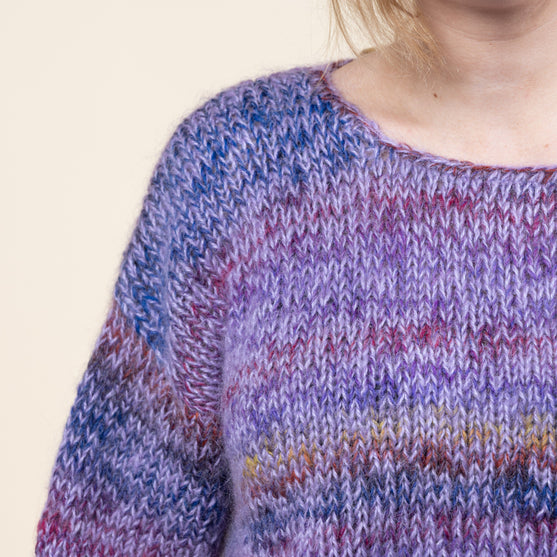 Se on neulottu kahdella lankasekoituksella. Mohairin, villan ja akryylin yhdistelmä tekee siitä ihanan runsaan, ilman painoa. Kaunis Manyana-langan väritys puseroon paljon eloa, ja sen voi luoda monessa eri värissä.