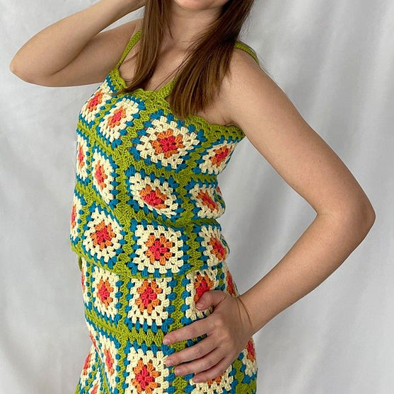 Lisää ripaus kesäväriä vaatekaappiisi virkatun topin mallillamme. Tämä projekti on suunniteltu sopimaan saumattomasti yhteen hamemallimme kanssa, ja myös siinä on klassisia isoäidin neliöitä eloisissa kesäsävyissä. Selkeiden ohjeiden ja vaiheittaisten kuvien ansiosta se on täydellinen malli kaiken tasoisille virkkaajille. Kohota kesätyylisi uudelle tasolle tällä viehättävällä lisäyksellä käsin virkattujen neuleiden vaatekaappiisi!
